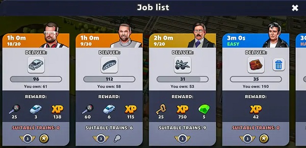游戏会给您安排任务,也可叫做“工作”。大体上,您得向其交付一定数量的特定商品。此项任务并无时间限制,不过部分工作要求使用特定类型的机车。从上方的屏幕截图能够看出,有些工作显示“无合适火车”,这表明我手头没有任何符合要求且处于空闲状态的史诗级机车。