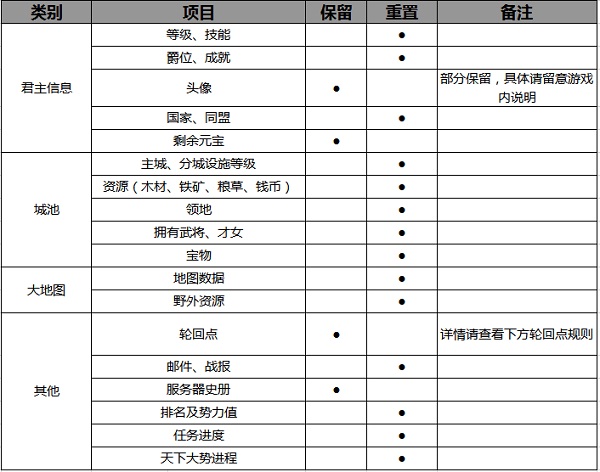 A:游戏角色数据将进行重置,不过角色头像、剩余元宝等相关信息会予以继承。详细内容可参照下表。