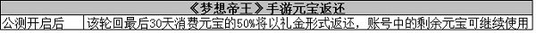 A:轮回角色能够继承轮回点,而且在服务器轮回前30天内所消费金额的50%以及剩余的元宝,会依照以下规则予以返还。