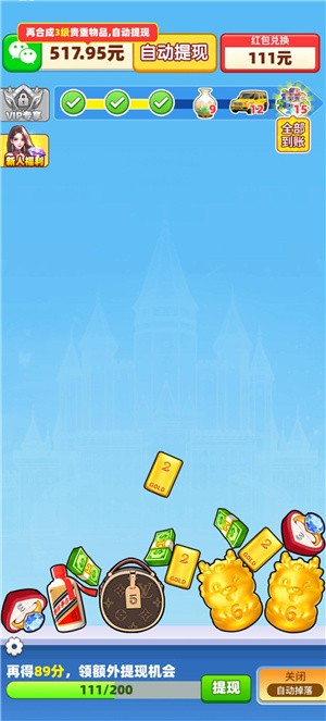 游戏中的红包是可以提现的。玩家只要合成物品,就能获取红包。新玩家进入游戏后,随意合出几个物品,便能够满足提现要求。游戏内红包按照百分比提现,合成物品的等级越高,提现比例也就越高。