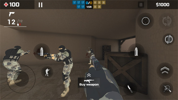 6、左侧滑动轮盘控制人物角色移动,右侧可以设计换弹,接下来就可以开始游戏啦;