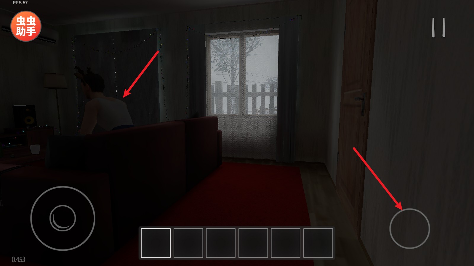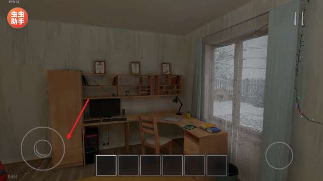 1、在游戏里,我们的目标是逃离家门。首先来熟悉一下操作,左侧摇杆用于控制移动,拖动屏幕便能转换视角。