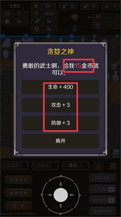 核心玩法是策略性回合制战斗与资源管理。玩家通过击败怪物获取经验值与金币,用于提升自身属性(攻击、防御、生命)或购买钥匙与道具。战斗结果由精确的数值计算决定,无需操作,强调“战前规划”。游戏包含丰富的NPC互动、支线任务与隐藏房间,探索是游戏进程的重要部分。