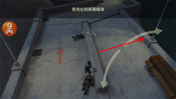 2、执行瞄准动作,通过滑动右侧屏幕来完成瞄准,同时调整射击角度,以精准锁定敌人,进而提高射击的命中率,为向敌人发起攻击做好前期准备。
