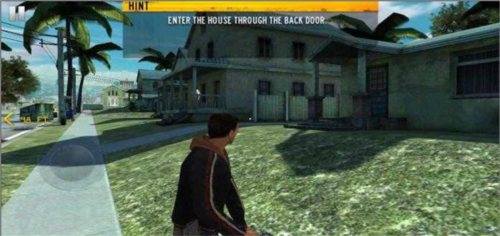 8、在游戏里面还会出现下图这样的攀爬的场面,玩家只需要控制自己的任务跳上房檐以后然后进行滑动操作,所有滑动就是左右的移动,上下滑动就是上下的移动。这个在任务模式里面有些地方会用得到。