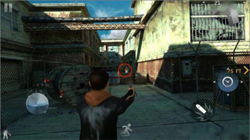 7、在游戏屏幕的左下方有一个小人拿着枪的样子,那个是可以转换人物的状态的,主要就是站着或者是蹲着的切换。这个在进行躲避敌人的伤害的时候非常的有用。同时玩家可以看到下图有一个黄色的光圈,那个是玩家可以完成任务的地方,比如爬窗或者是踹门等等。