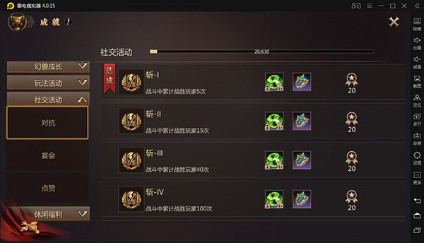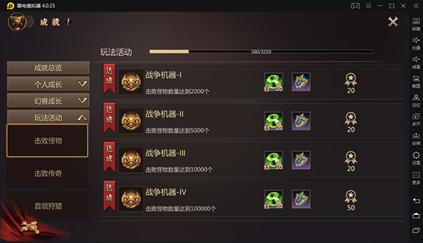 在《风暴魔域2》手游中,成就系统共有五个板块,分别是个人成长、幻兽成长、玩法活动、社交活动以及休闲福利。
