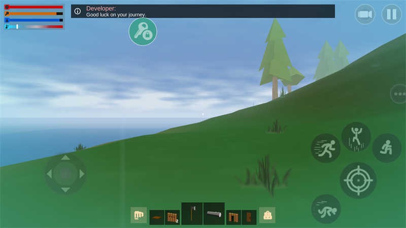 1、捡木头和石头来制作工具。制作武器,保护自己免受僵尸骚扰并收获僵尸和野生动物的装备。