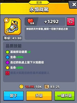 鞋子:有S鞋就用S鞋,前期S鞋的火焰路径堪比一把武器的伤害,没S鞋就用能量鞋,能量跑鞋稳定加减伤和输出,击败敌人后刷新3秒时间,意思就是一直杀小怪一直加输出。能量鞋比军用鞋好一点,军用在激励不受击的前提下才有属性加成,受击后完全无属性加成,当然10%的生命加成还是在的。