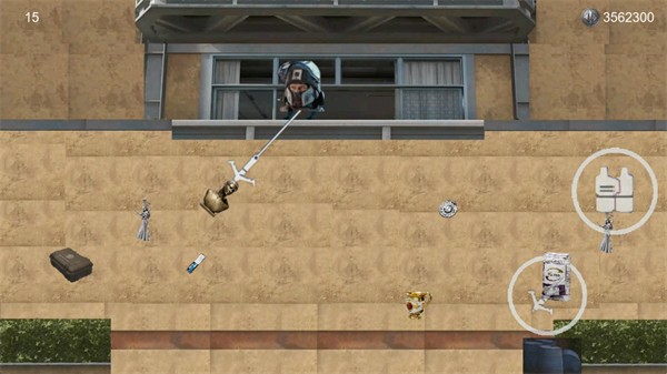 3、正式开始后滑动屏幕可以控制角色移动,点击右侧的钩爪按钮可以可以发射钩爪抓取物资。