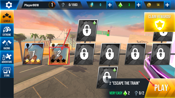 1. 选中【关卡 - 2】,点击【PLAY】启动游戏。此关卡要求在规定时间内完成,要提前为后续收集金币与钥匙做好准备。