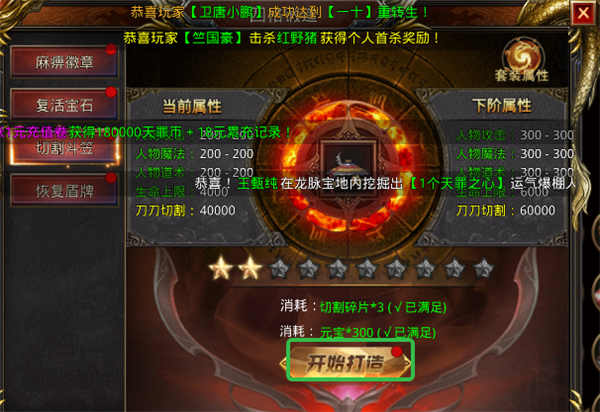 5、玩家拥有足够切割碎片以及元宝就可开始打造,提升战斗力。