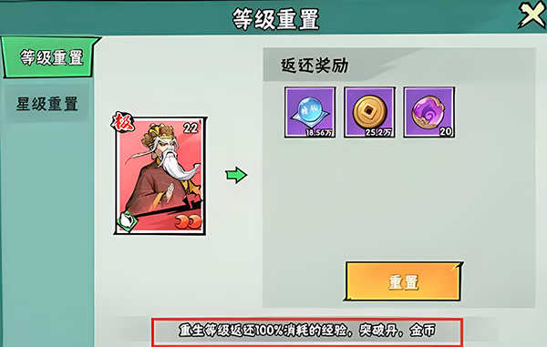 1少侠若抽到更优质的侠客,可对之前投入资源的侠客进行重置。重置包含等级重置与星级重置,如此能避免前期在侠客资源投入上的损耗。而且,等级重生会100%返还消耗的经验、突破丹以及金币,完全不存在损耗哦!
