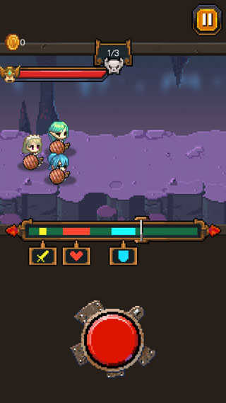 5、如果玩家觉得自己的金币不够用,那么我们可以选择去洞窟探索。整个探索过程,我们可以遇见三批敌人,每次敌人来之前,我们都可以使自身获得一个提高,也就是在上面的那个进度条指到相应的颜色区域时,按下红色按钮,在每一波敌人出现之前可以按下三次。蓝色可以增加防御力,黄色可以增加攻击力,红色可以增加体力。在探索完毕以后,也有一定的几率获得新的武器制作方法