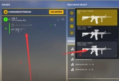 若左边呈现出带有1号箭头的界面,同时你的人物左侧伴有绿色竖杠,且出现“A”字样,这就表明你是该小队的队长。此时,在右侧选择装备,然后进入地图(建议选择带有2号箭头的光瞄步枪)。