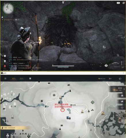 4、然后前往下面的点,使用火箭射击藤蔓,进入洞中,在箱子旁边拿到绣着“邪”字的奇怪钱袋;