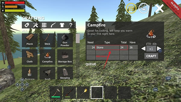 6、搭建完成后,可以在INVENTORY中看到一个营火图标,拖动这个图标到石斧等一行的那6个小框框中。