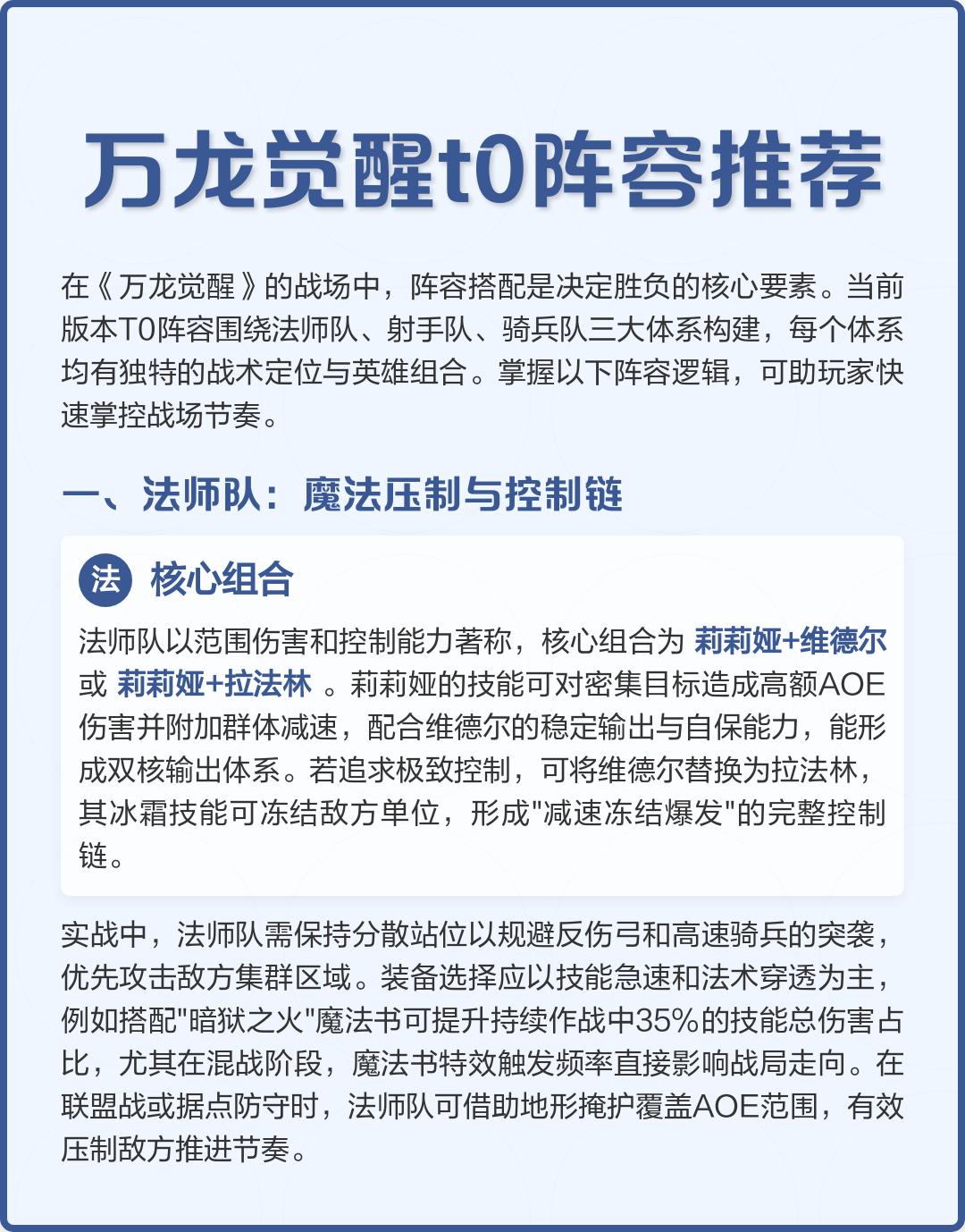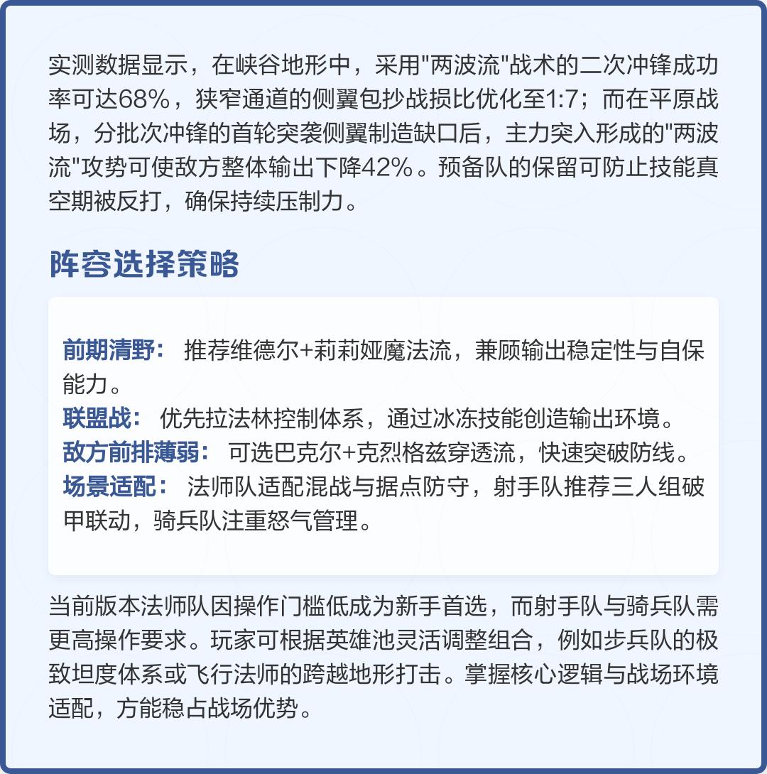 法师队:务必保持与敌方近战部队的安全距离(1500码以上),优先攻击敌人扎堆的区域以最大化AOE效果。莉莉娅可通过首充获取,维德尔则是性价比极高的平民战神。