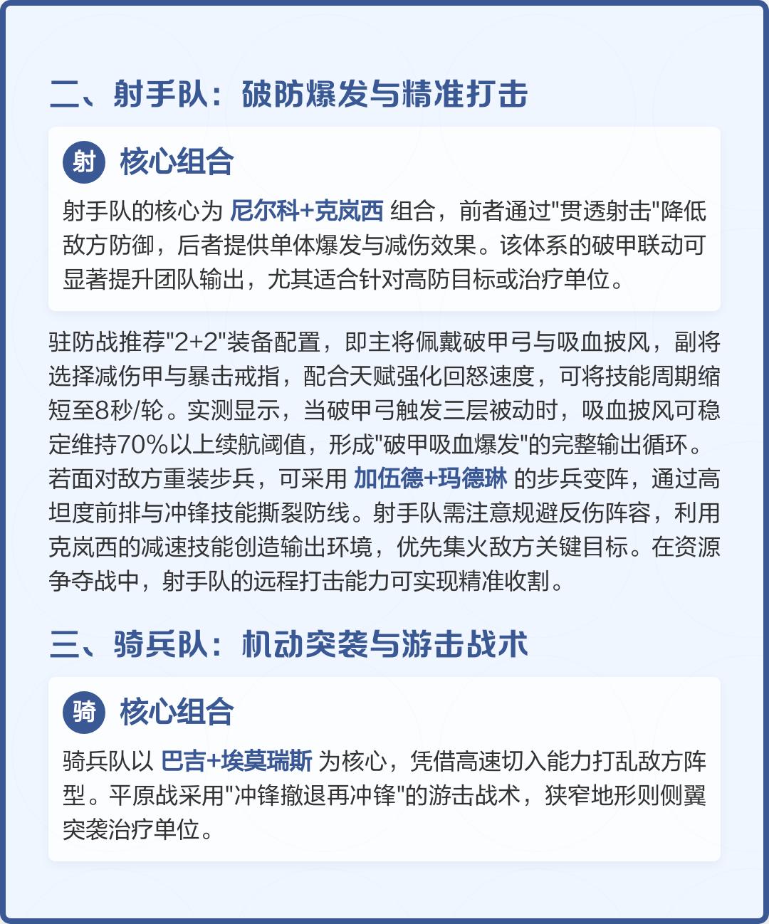 骑兵队:精髓在于【绕后】。利用高移速穿越复杂地形,直接攻击敌方的法师和射手。埃莫瑞斯的觉醒技能在2秒内可触发两次激昂效果,时机把握至关重要。