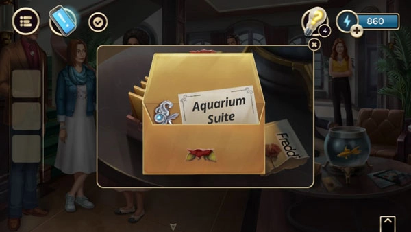 3把水递给对面的女士,等剧情推进后,打开穿紫色衣服的女性手里的行李箱,接着走进房间,在桌上卡拉的邀请函里找到钥匙。