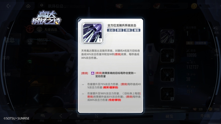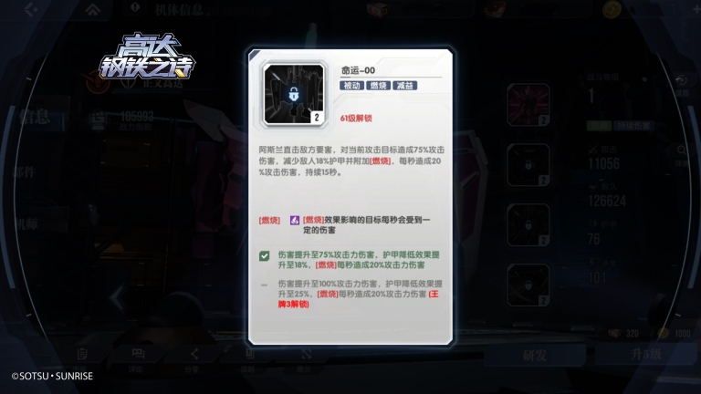 以自由高达为例,它的主动技能【全炮门发射】在攻击处于“燃烧状态”的敌人时,能够获得额外的伤害加成(该效果需要通过研发机体并提升星级来解锁)。要是目标被这个技能击坠(即耐久值降到零),自由高达就可以恢复100点能量。