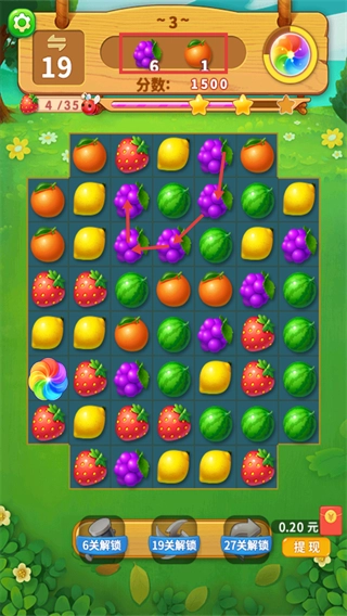 2、本关的收集任务是完成【葡萄-6】和【橙子-1】的目标,目前分数为【1500】,【草莓-4/35】的进度还需要提升,建议优先消除聚集在一起的【葡萄】。