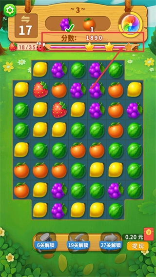 3、完成【葡萄】收集后分数更新至【1890】,【草莓-18/35】的进度随之加快,接下来可瞄准聚集的【橙子】与【柠檬】进行消除,以此进一步提升效率。