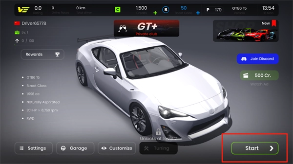 1、启动极速狂飙,选定车辆后点击【Start】按钮开始游戏