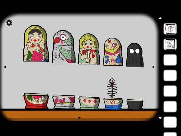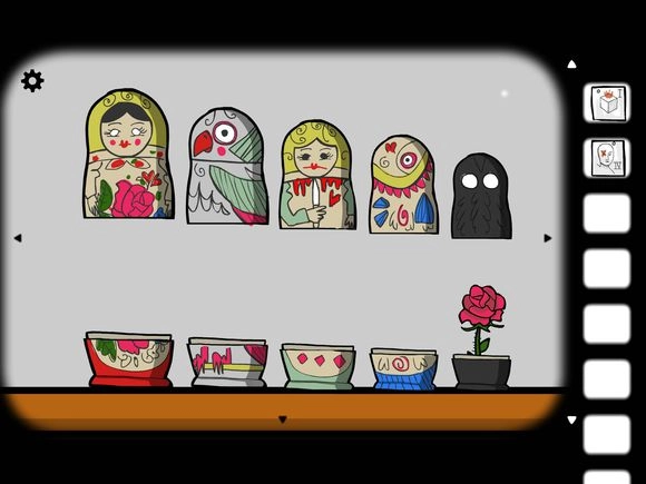 7、点击柜子里的套娃,把它们逐个摆出来。黑影套娃里面藏着花,将花移到女人套娃上并合拢,再次打开就会出现鱼,按照这个规律依次操作,最后就能得到钥匙。