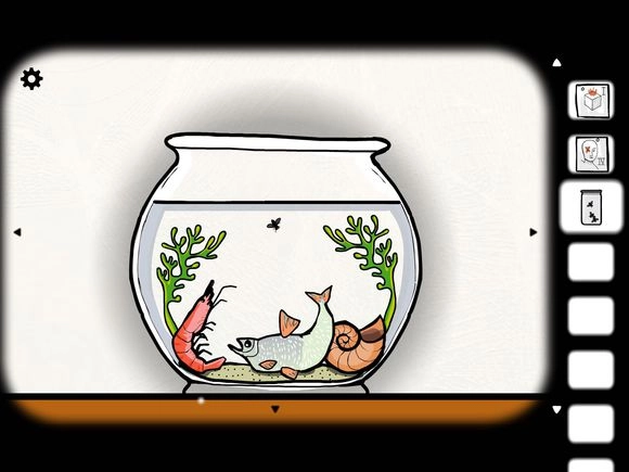 9、点击鱼缸进入对应的场景,把萤火虫投入鱼缸中。接着点击左侧的水草,萤火虫会向右飘入贝壳里,此时会有一根手指顶出并点亮萤火虫。之后再点击右侧的水草,萤火虫会飘进鱼的嘴里,鱼吃掉萤火虫后便会消失,随即出现一把钥匙。