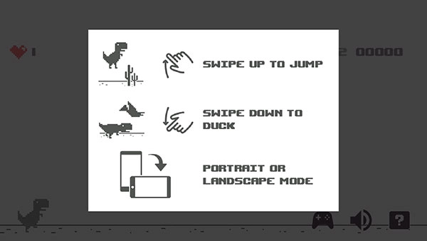 点击屏幕中央的播放按钮就能启动游戏,碰到障碍物时,向上滑动屏幕能让小恐龙跳起,向下滑动屏幕可让小恐龙蹲下,通过这种方式避开仙人掌、飞鸟之类的障碍物。