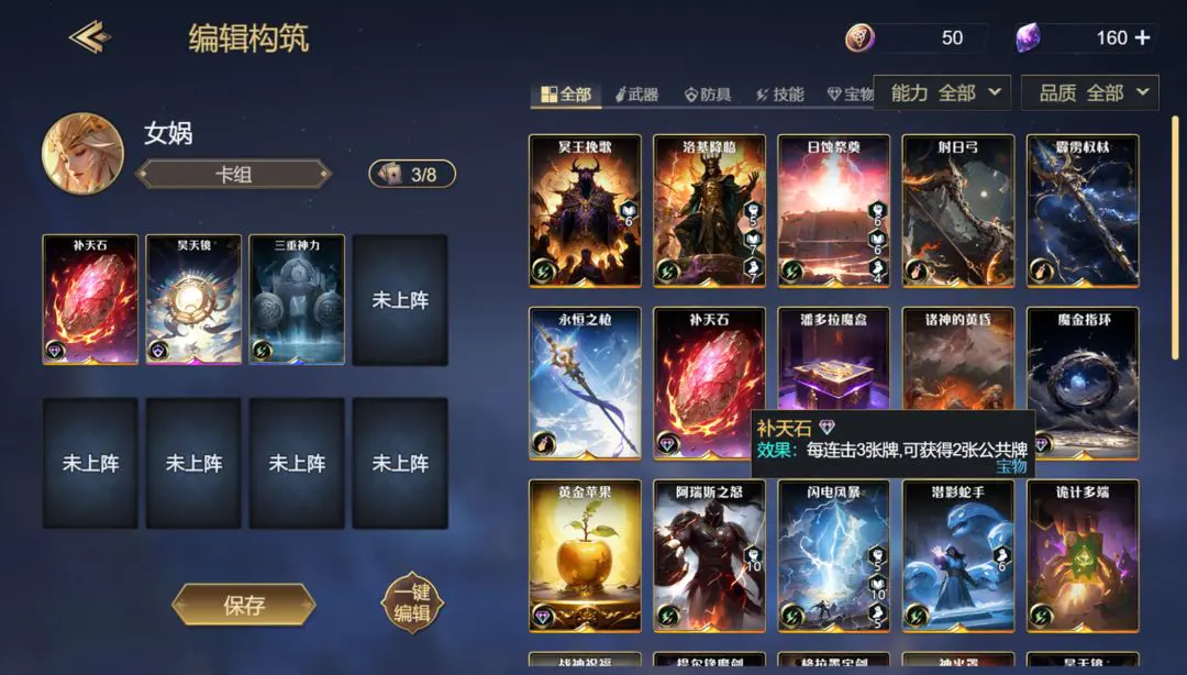 手牌由公共牌与构筑牌构成,构筑牌包含装备牌(武器、防具、宝物)和技能牌两类。装备牌能够装配在神灵身上,而技能牌在打出后会呈现出各异的效果。