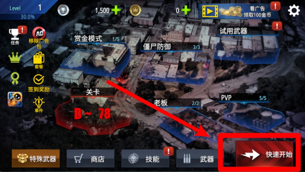 1. 关卡快速开始:点击主界面右下角的“快速开始”按钮,就能直接进入当前关卡挑战,无需多余操作,既省时间又便捷,很适合用来刷分或者挂机通关。