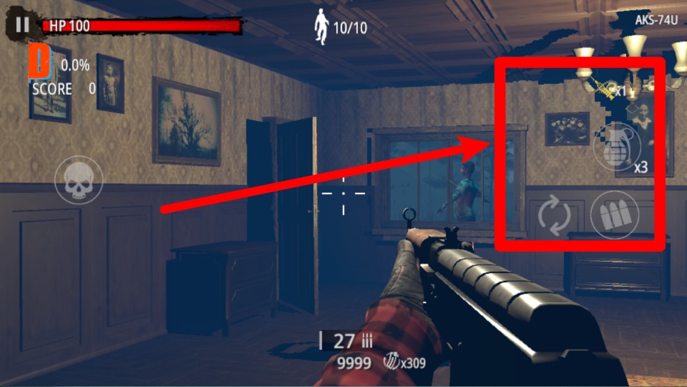 2. 投掷物使用提示:右侧区域会显示当前可使用的手雷数量,点击对应图标即可快速投掷出去。这种投掷物适合用来对付大批逼近的僵尸,其爆炸范围较大且伤害较高,在危急时刻能够帮助玩家保全性命。