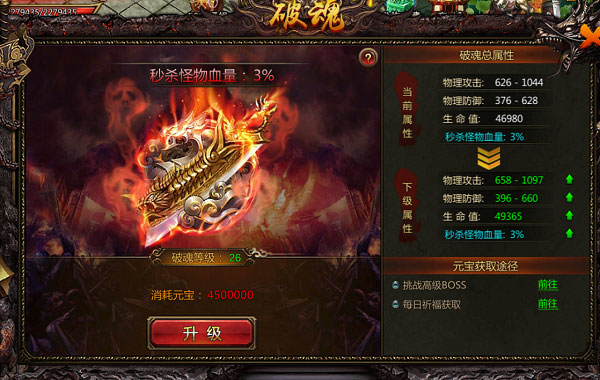 所谓破魂秒杀怪物血量,即是玩家在攻击怪物造成伤害时,有几率触发扣除怪物的百分比血量效果。破魂具有等级设定,在消耗元宝,提升破魂等级时,秒杀怪物血量的百分比也会随之增加。等级越高,百分比伤害越高。
