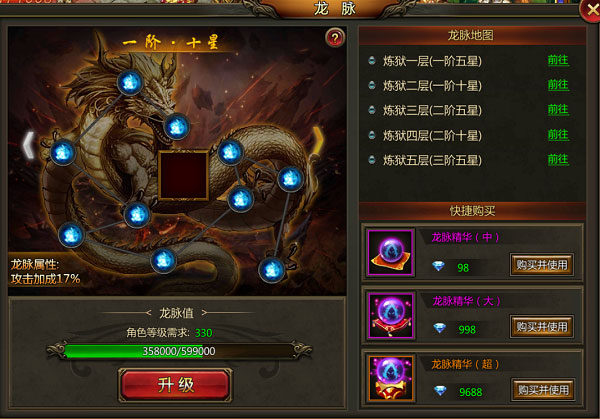 龙脉系统是用于提升攻击加成的系统,能够以百分比形式显著增加玩家的攻击属性。该系统的每个阶段包含十个等级,玩家每提升一级龙脉等级,就能获得相应的攻击百分比加成。
