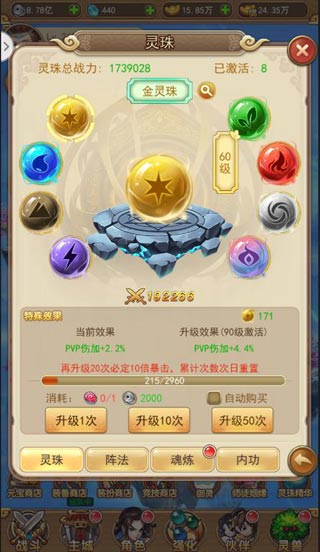 如图所示,一共有8种灵珠,它们分别是金、木、水、火、土、风、雷、魂。灵珠能提供pvp、pve、伤害、爆伤这些属性增益。激活每一种灵珠都需要30个对应的碎片,而对灵珠进行升级可以进一步提升这些属性增益效果,从而为角色带来显著的战力加成。