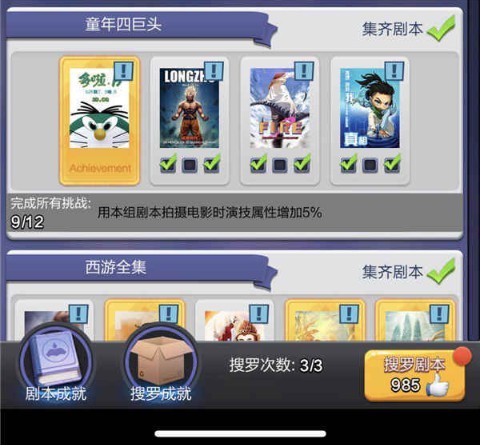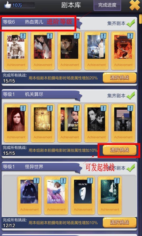 从上图中能够看到,只有当某一排的所有剧本都已获取,并且全部完成了剧本“镀金”操作后,我们才具备进行该排剧本挑战的资格。而且在这种情况下,剧本挑战所带来的额外效果加成,是覆盖这一排剧本内的每一个剧本的。每完成一次剧本挑战,原有拍摄属性的加成会提升1%,对应的等级也会随之上升1级(该数值会随着等级的提高而发生变化)。