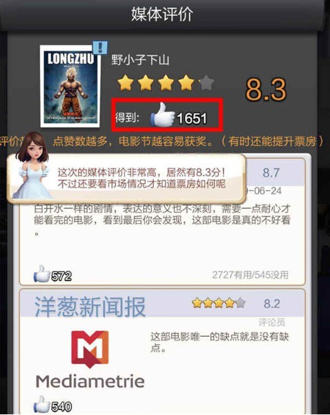 每部影片拍摄完成后,在媒体完成评价之后,都会获得点赞数的奖励。
