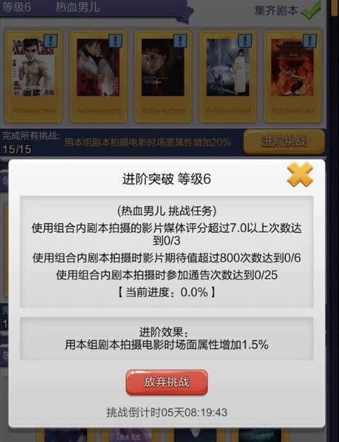 发起挑战后,系统会随机生成三个难度各异的挑战任务,同时清晰标注出完成剧本挑战后剧本属性的具体提升情况——以上图为例,剧本等级将从5级进阶到6级,使用该组剧本拍摄电影时的场面属性会在原有20%的基础上提升至21.5%,而整个挑战的时间限制为一周。