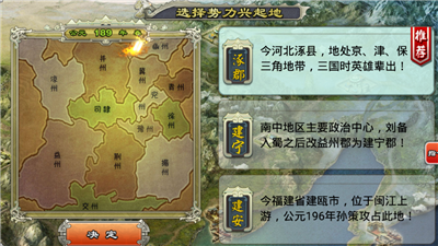 进入游戏初始阶段,有三个势力领地可供选择。由于刘备是幽州涿郡涿县人,这一点广为人知,因此系统推荐的领地是涿郡。