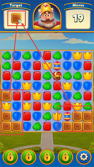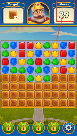 1、本关卡的目标为收集【33个皇冠方块】,目前还剩余【29步操作机会】,建议优先消除皇冠方块所在区域的元素,以此来加快关卡进度。