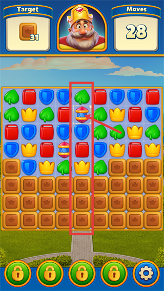 2、合成【竖列特效道具】后,使用该道具能够消除一整列元素,从而快速减少下方皇冠方块所面临的遮挡障碍。