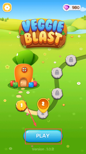 1、启动游戏:首先打开游戏主界面,查看版本号1.0.2,点击“PLAY”进入关卡地图。