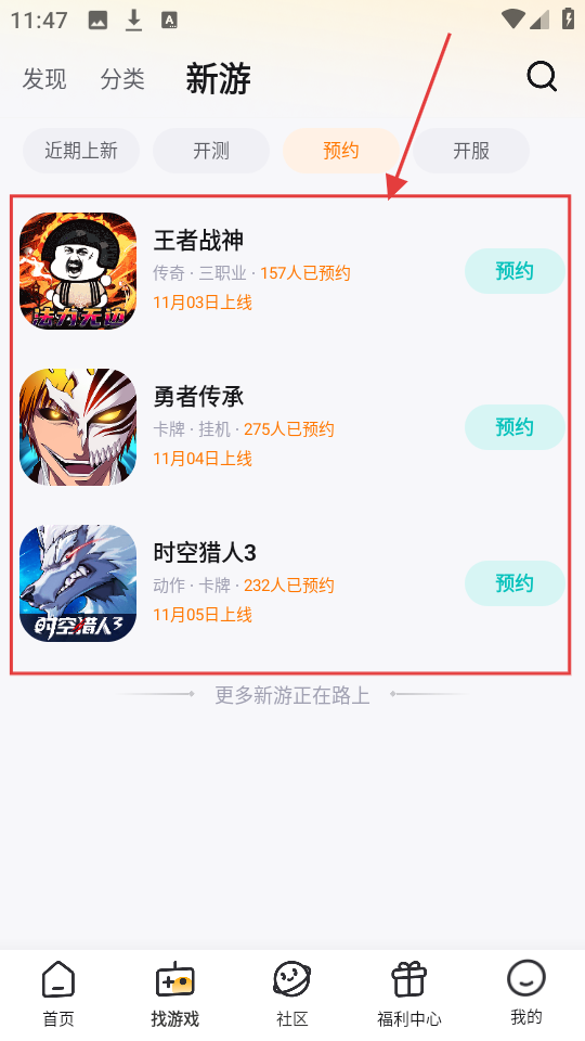 在预约列表中,包含《王者战神》《勇者传承》等游戏,你可以挑选自己感兴趣的游戏。