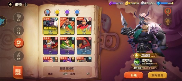 统帅变身卡可通过占星系统获取,传说级英雄汉尼拔是典型的高爆发型英雄。若为他搭配“抹杀”与“致命一击”这两个战法,便能让其技能伤害达到极致:“抹杀”能为汉尼拔增加20%的技能伤害,凭借这一效果,他足以秒杀绝大多数射手和法师英雄;“致命一击”则可使汉尼拔对生命值低于30%的敌方英雄造成更高伤害。如此搭配下,汉尼拔将化身为令人胆寒的战场杀手。