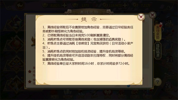 除了角色能获取经验外,挂机精灵的经验同样会增加。当挂机精灵升级时,玩家能得到更多“扫荡特权”,可以用扫荡券去扫荡之前不能扫荡的试炼副本,而且在后续的离线挂机过程中,还能获得更高的铜钱收益、掉落加成以及经验加成!