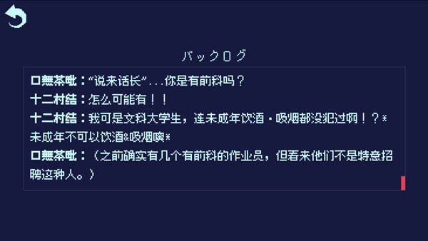 3、15分钟紧凑剧情:一周目流程时长仅约15分钟,采用极简操作模式——只需点击屏幕即可推进剧情对话,无需复杂操作。短平快的节奏设计,十分适合利用碎片时间完整体验一遍故事。