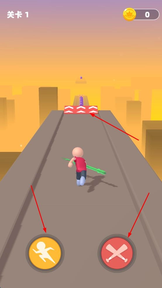 在关卡中操控角色奔跑,遇到障碍时点击下方按钮,灵活切换冲刺或攻击动作,突破阻拦,稳步推进关卡进程。