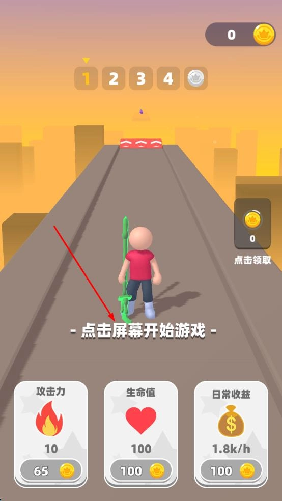 初始界面可查看攻击力、生命值与日常收益,点击屏幕即可开启关卡,借助基础属性规划前行策略,为跑酷挑战做好准备。
